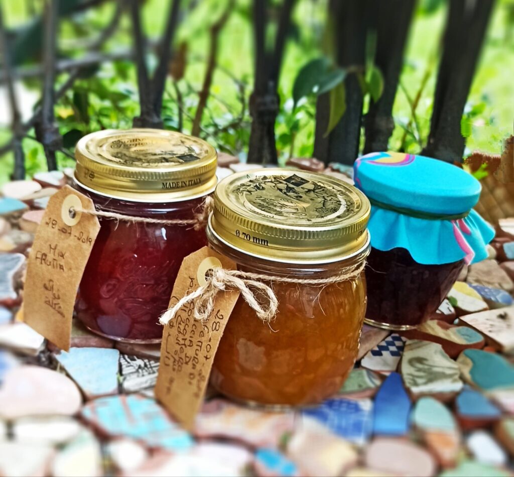 Aprono uno scrigno di marmellate fatte da lei: buccia di cocomero, fichi, mela-pera, succo di pesca e un po’ fuori tema un barattolo di conserva di pomodoro in pezzi.